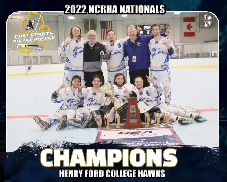 Henry Ford College wins the NCRHA 2021-2022 Junior College Division National Championship, by going 3-1 in the best-of-five championship series against West Valley College. In the deciding game, it was Henry Ford’s Devin Stroia (3 G, 2 A), Nicholas Mangiapane (2 G, 2 A) and Spencer Morrison (1 G, 3 A) leading the way to the title. Henry Ford goaltender Carter Pattenaude stopped all 18 shots faced in the win.